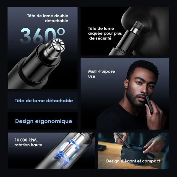 Lames en acier inoxydable à double tranchant amovibles pour une coupe à 360°, restant tranchantes et douces sur votre nez.