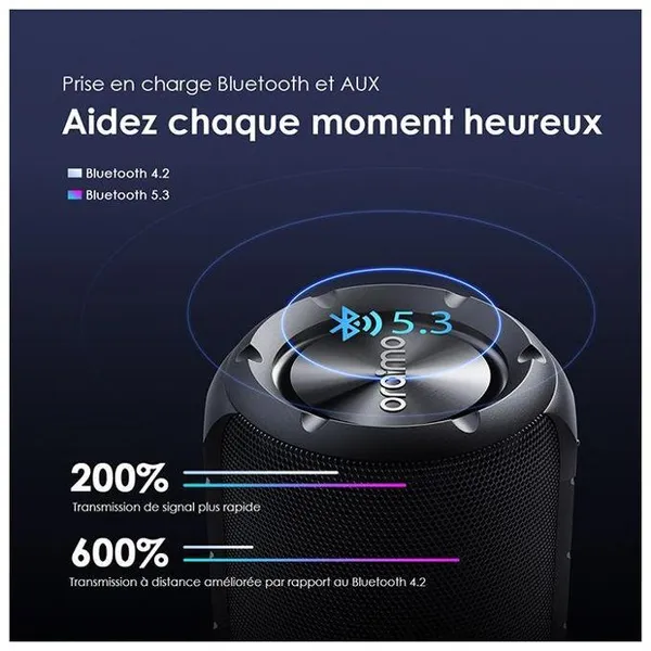 Transmission plus rapide, connexion plus stable et compatibilité renforcée avec Bluetooth 5.3 – rendez votre fête plus facile, gratuite et plus amusante. Connectez simplement votre téléphone portable, votre tablette ou votre ordinateur via Bluetooth pour écouter de la musique, et il est facile de créer l’atmosphère parfaite pour votre événement.