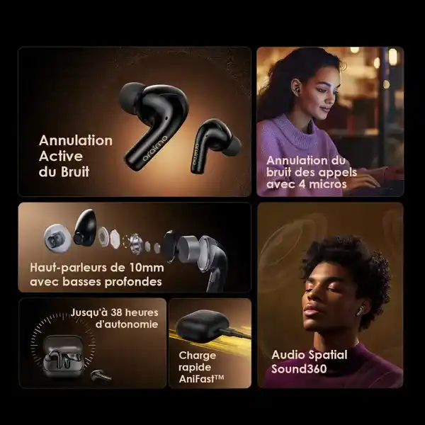 Conçue pour adapter votre expérience audio : Activez le Mode Audio Spatial Sound360, Ajustez l’Annulation du Bruit, Égaliseur Personnalisé, Activez le Mode Jeu, Vérifiez l’État de la Batteriemusique.