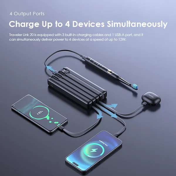 Le Traveler Link 20 est livré avec des câbles de charge Type-C, Micro-USB et Lightning intégrés pour répondre à vos besoins de charge quotidiens.